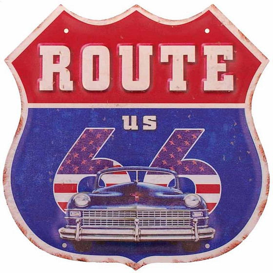 Metalen schild - Route 66, Blauw/rood, blauwe auto