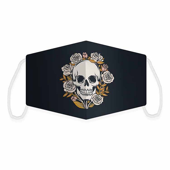 Herbruikbaar mondkapje met een afbeelding van schedels en rozen om bijvoorbeeld te dragen in het openbaar vervoer. Of bij sociale- en maatschappelijke gelegenheden in de openbare ruimte.