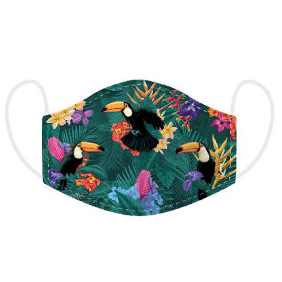 Herbruikbaar mondkapje met de afbeelding van een toekan om bijvoorbeeld te dragen in het openbaar vervoer. Of bij sociale- en maatschappelijke gelegenheden in de openbare ruimte.