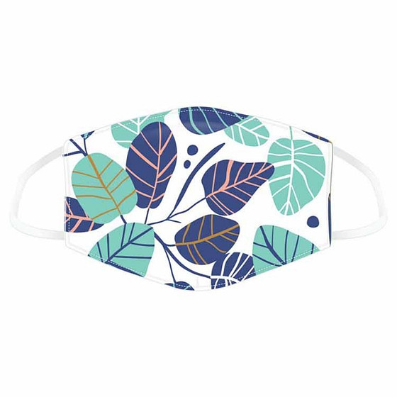 Herbruikbaar wit mondkapje met blauwe bladeren om bijvoorbeeld te dragen in het openbaar vervoer. Of bij sociale- en maatschappelijke gelegenheden in de openbare ruimte.