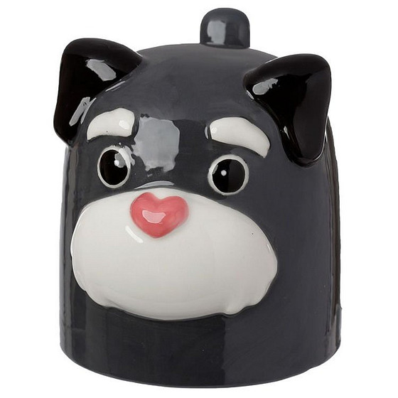 Geweldige grote aardewerk beker in de vorm van een hond/ Schnautzer. De beker staat ondersteboven op de pootjes. Zeer sprekende uitdrukking en prachtig in kleur afgewerkt. De beker heeft een robuust handvat.