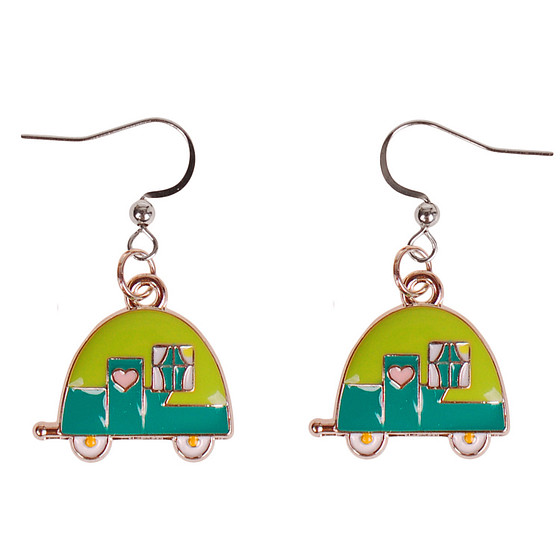 Oorbellen Zilverkleurig - Hangertje Caravan blauw/groen zilverkleurig geëmailleerd 2cm