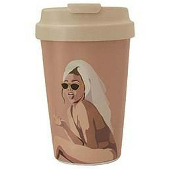 PLA/plant bioloco beker to go met daarop een getekende afbeelding van een vrouw met een zonnebril op en een handdoek op haar hoofd.