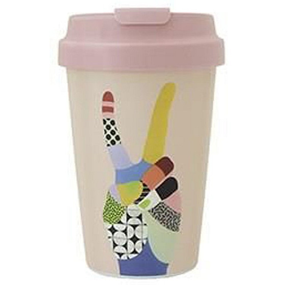 PLA/plant bioloco beker to go met daarop een hand met een peace teken in verschillende vrolijke kleuren en patronen