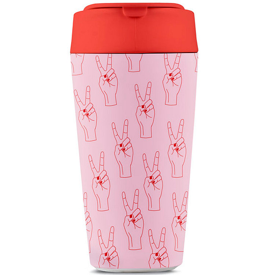 Op deze vrolijke roze beker zie je een patroon van rode handen met een peace teken.