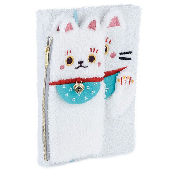 Schattig pluche notitieboekje in de kleur wit met daarop Maneki Neko Gelukskat!