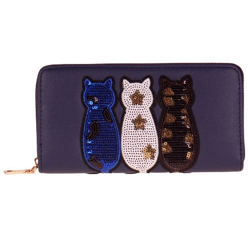 Portemonnee blauw met drie gekleurde poesjes en pailletjes - 20x11 cm