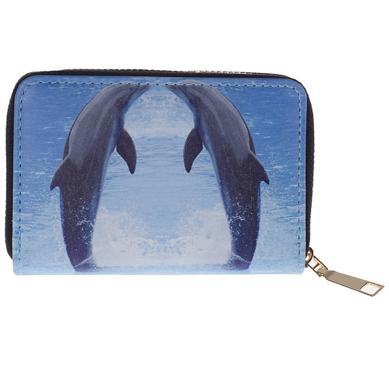 Stoere portemonnee met aan beide kanten een afbeelding van 2 dolfijnen. De leuke foto is van een mooie kwaliteit en gedrukt op de een zachte maar stevig materiaal. Om de portemonnee te openen maak je gebruik van een robuuste goudkleurige rits.