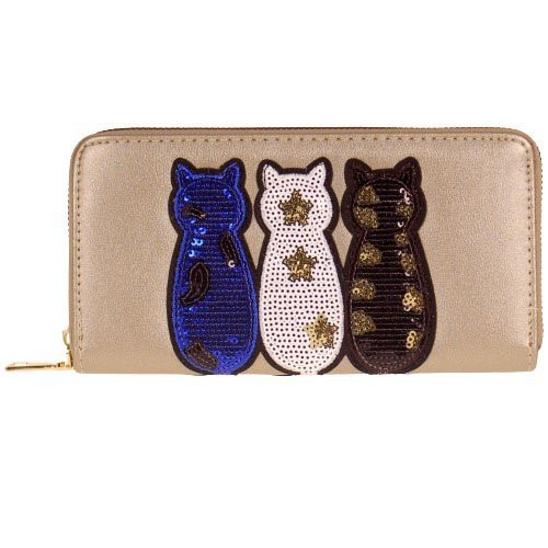 Portemonnee goud met drie gekleurde poesjes en pailletjes - 20x11 cm
