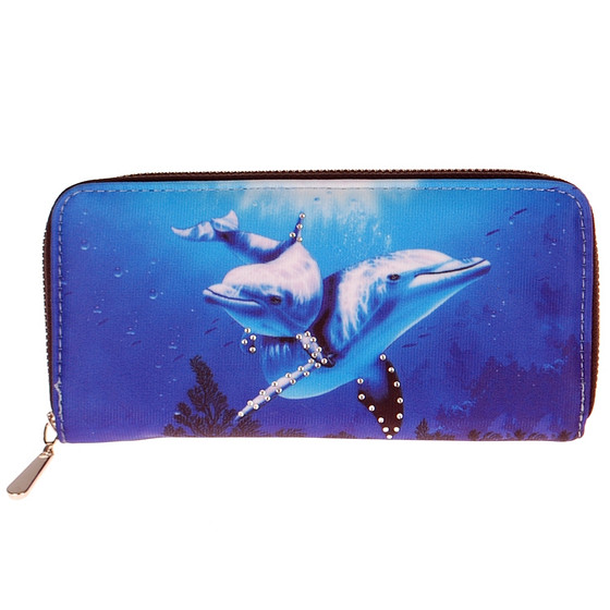 Leuke grote blauwe portemonnee met een mooie afbeelding van dolfijnen.