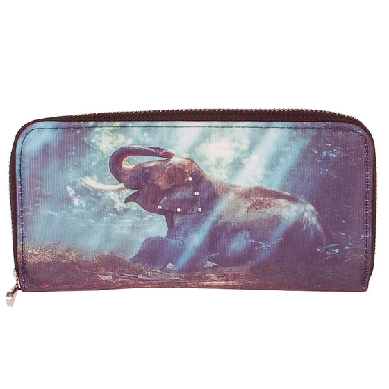 Leuke grote portemonnee met een afbeelding van een olifant. De portemonnee is gemaakt van een zachte, soepele maar stevige stof. Op de stof staat, aan beide kanten, een kwalitatief hoogwaardige print. Aan 1 zijde is de print versierd met enkele kleine strass steentjes.