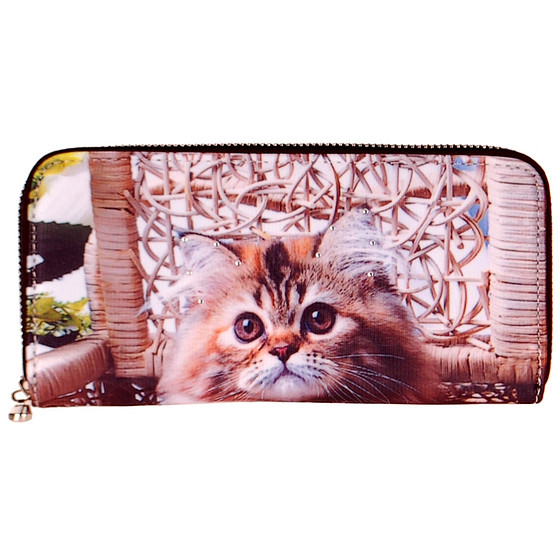 Leuke grote portemonnee met een afbeelding van een poes. De portemonnee is gemaakt van een zachte, soepele maar stevige stof. Op de stof staat, aan beide kanten, een kwalitatief hoogwaardige print. Aan 1 zijde is de print versierd met enkele kleine strass steentjes.