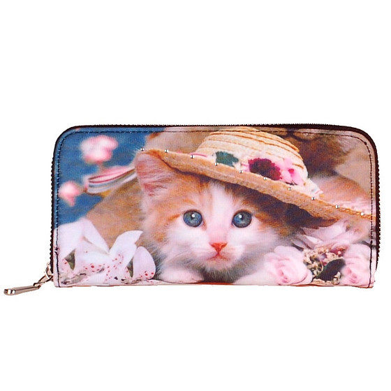 Leuke grote portemonnee met een afbeelding van een poesje. De portemonnee is gemaakt van een zachte, soepele maar stevige stof. Op de stof staat, aan beide kanten, een kwalitatief hoogwaardige print. Aan 1 zijde is de print versierd met enkele kleine strass steentjes.