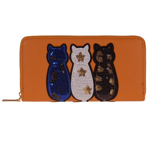 Portemonnee mosterdgeel met drie gekleurde poesjes en pailletjes - 20x11 cm