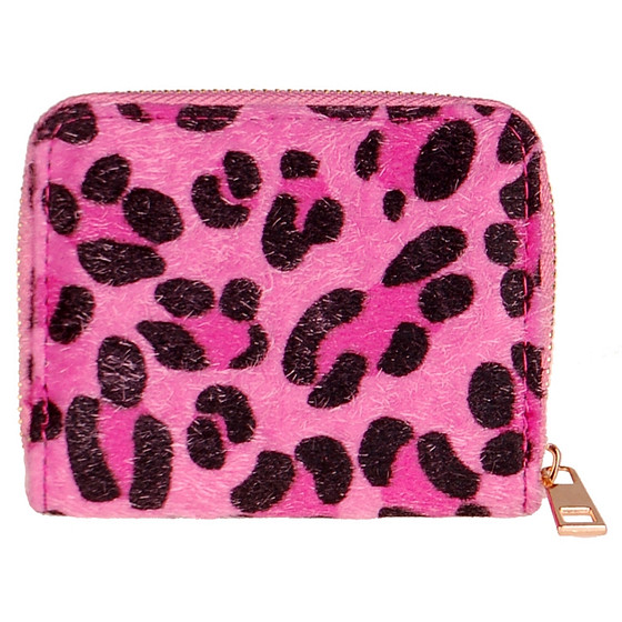 Leuke roze portemonnee met 'harige' luipaard print. Om de portemonnee te openen maak je gebruik van een robuuste goudkleurige rits. Bij het openen zit aan de binnenzijde van de portemonnee een apart met rits afsluitbaar vakje voor klein geld. Verder is er voldoende ruimte voor papiergeld en verschillende insteek vakjes voor pasjes.