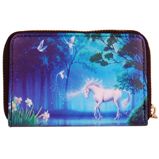 Op deze portemonnee staat een afbeelding van een eenhoorn in een magisch bos.