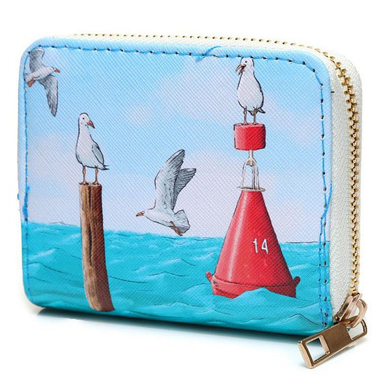 Schattige compacte portemonnee met beide kanten een print van zeemeeuwen op een meerpaal en een boei.