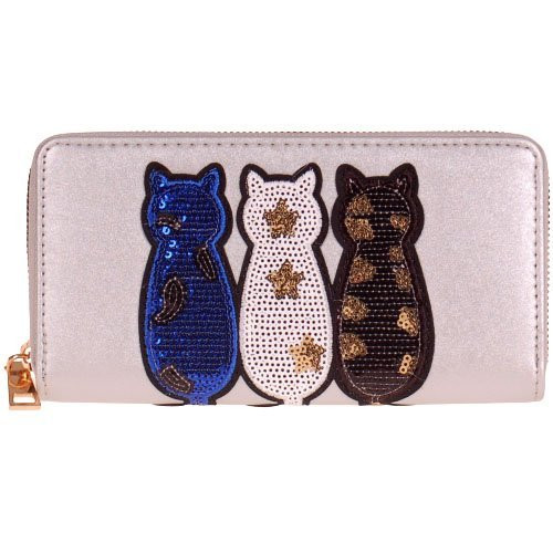 Portemonnee zilver met drie gekleurde poesjes en pailletjes - 20x11 cm