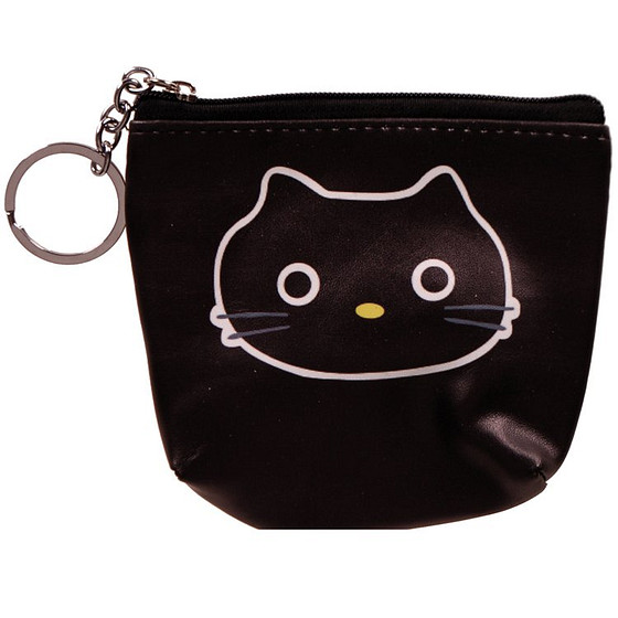 Een zwarte portemonnee waarop een de tekst waarop staat: "Cat is always right" te lezen is.