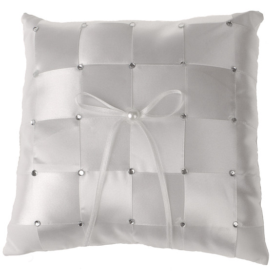 Mooi witte ringkussen met een luxe uitstraling. De bovenkant van het kussen heeft gevlochten banen van stof. Op de hoeken van de banen is het ringkussen afgezet met strass steentjes. In het midden van het kussen zit een lint waarmee de ringen vast kunnen worden gemaakt. Dit lint is afgezet met een pareltje.