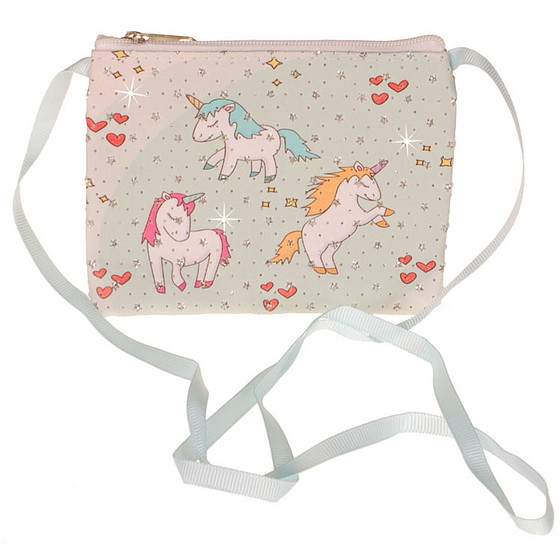 Lief klein schoudertasje met een afbeeldingen van eenhoorns en heeft leuke glitters.