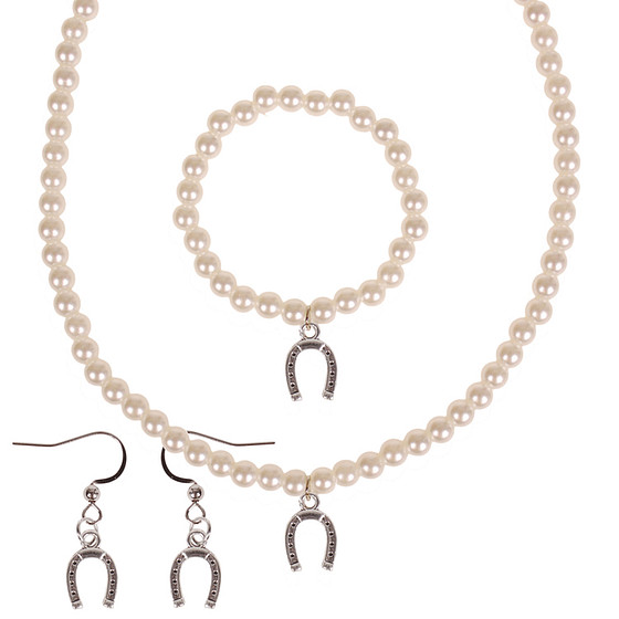 Set - Kinderketting, armbandje en oorbellen - ivoorkleurige immitatieparels 6mm - Hangertje Hoefijzer zilverkleurig 1cm