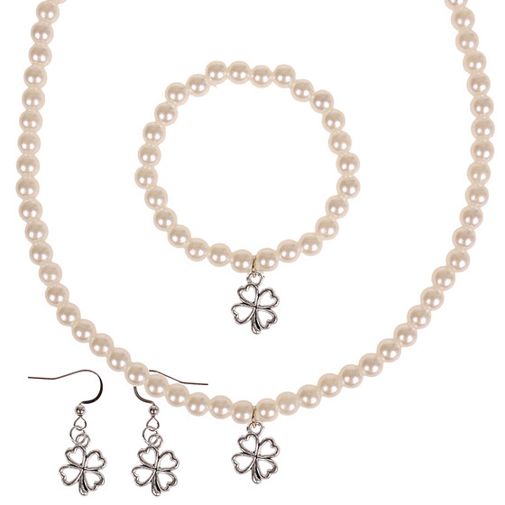 Set - Kinderketting, armbandje en oorbellen - ivoorkleurige immitatieparels 6mm - Hangertje Klavertje vier zilverkleurig 1,5cm