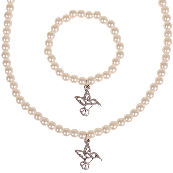Set - Kinderketting en armbandje - ivoorkleurige immitatieparels 6mm - Hangertje Kolibrie zilverkleurig 1,8cm
