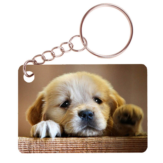 Sleutelhanger 6x4cm - Golden Retreiver Pup op Houten Balk