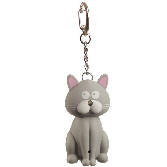 Sleutelhanger - Kat Lichtgrijs - Led Lampje & Miauw Geluid - 10x5,5x2,5cm