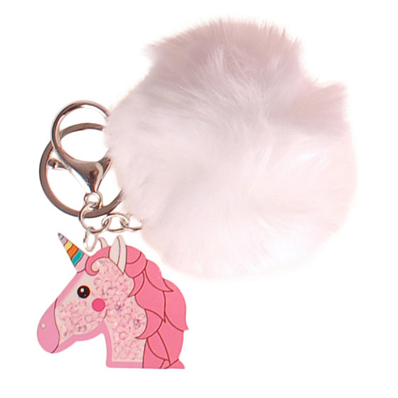 Sleutelhanger met Clip - Witte Pompom & Eenhoorn Transparant met Glitters - Pompom 8cm