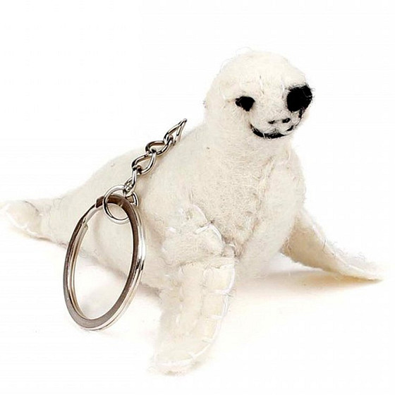 De sleutelhanger is in de vorm van een zeehond, gemaakt van vilt en wit gekleurd.