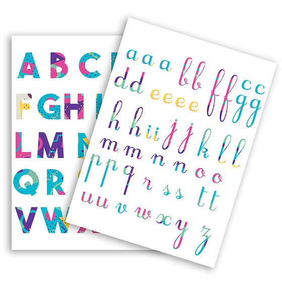 Stickers - Gekleurd Alphabet - Blokletters & Geschreven Letters - Scrapbook Hobby DIY - 2 Stickervellen - 1.5-2.5cm - 73 Stuks