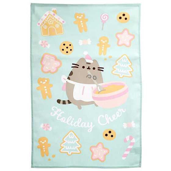 Theedoek in de kleur lichtgroen van Pusheen the Cat met daarop de tekst "Holiday Cheer".