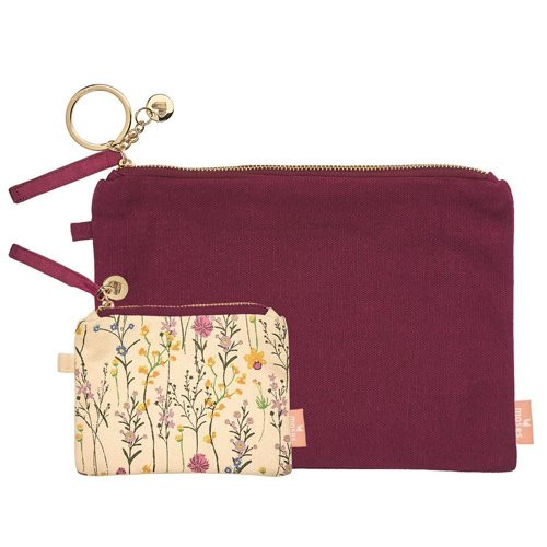 Een stijlvolle set toilettasjes bestaande uit twee delen. De grote toilettas is bordeauxrood en de kleine is versierd met een bloemenprint. Gemaakt van goede kwaliteit biologisch katoen.