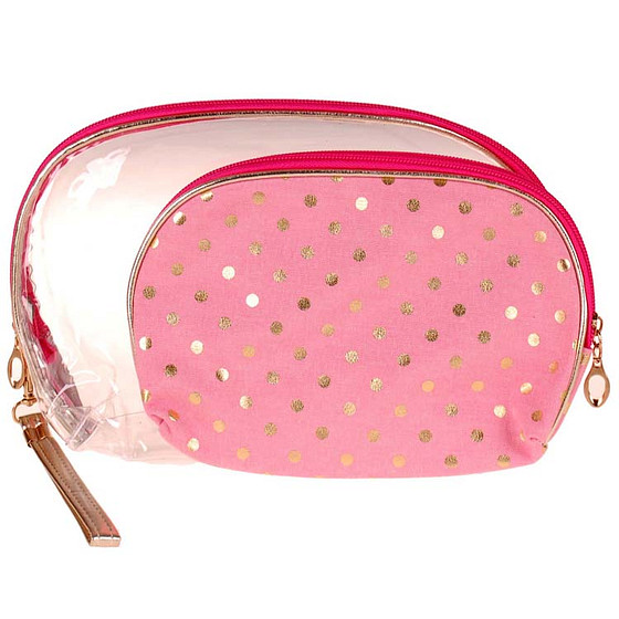 Toilettas Set Donkerroze - Transparant & Stof - Dots Goudkleurig - Rits & Handgreep - 21x13x2.5cm/26x16x6cm