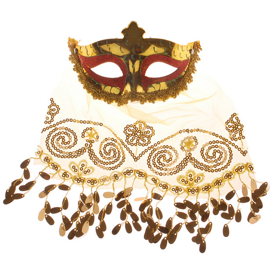 Goudkleurig masker met een sluier.