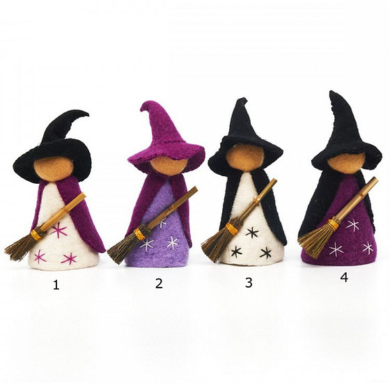 De vilten heksjes zijn hangemaakt en verkrijgbaar in verschillende kleuren.