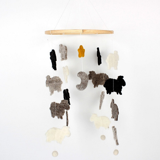 Lieve boxmobiel met Schaapjes, Maan en Sterren. Gemaakt van Vilt Zo kleed je de kinderkamer extra leuk aan.