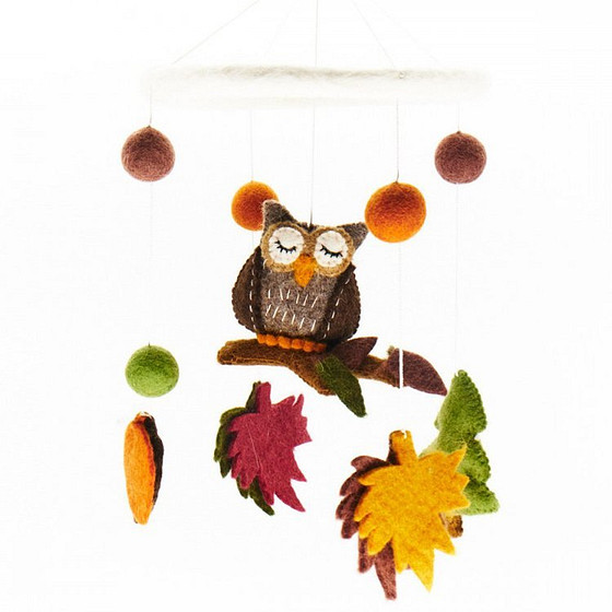Mooie Mobiele met witte ring en een Uiltje in Herfstbos. Aan deze babykamerdecoratie hangt een figuurtje van een Uiltje, Boom en Herfstbladeren gemaakt van Vilt.