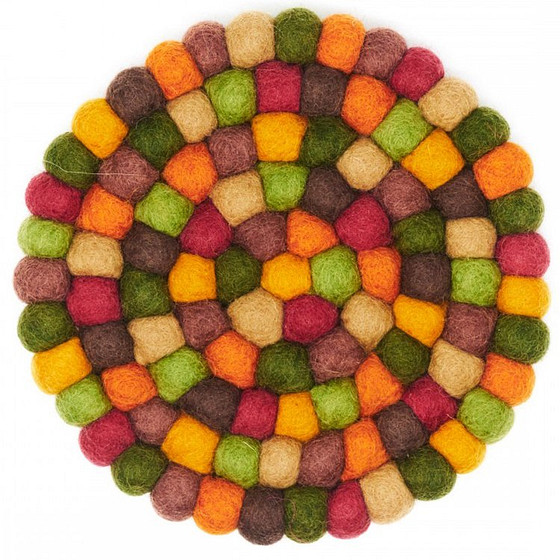 Een rond onderzetter gemaakt met bolletjes vilt.