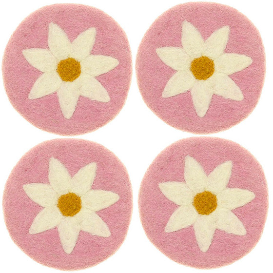Vilten Onderzetters - Set 4 stuks - Roze met Witte Margriet - 10 cm - Fairtrade