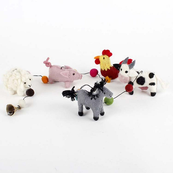 Aan het mobiel hangt een haan, schaap, ezel, varkentje en een koe.