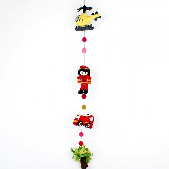 Vilten slinger met van boven naar beneden blushelikopter, brandweerman, brandweerauto, kat in boom en een vuurtje,onderaan hangt een belletje. Heel leuk voor in de kinderkamer, maar ook als decoratie in elk interieur!