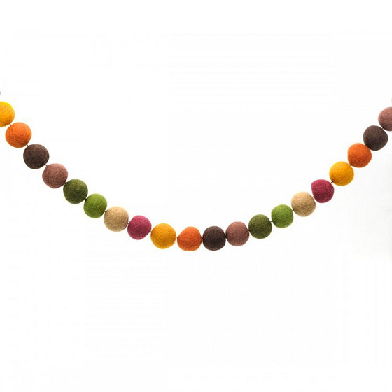 Deze vilten slinger is 150cm lang. De slinger is gemaakt met verschillende kleuren bolletjes. De kleuren van de bolletjes zijn rustige aardtinten.