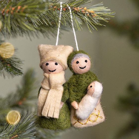 Wolvilt Hanger Jozef & Maria Kerst - Mistletoe Groen-Creme - Fairtrade Homedeco - 13x9cm